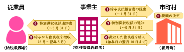 毎年1月末日までに給与支払報告書を提出してください。町が税額の計算を行い、5月に特別徴収義務者あてに「特別徴収税額決定通知書」を送付します。その税額を毎月の給与から徴収し、翌月の10日までに納入していただきます。