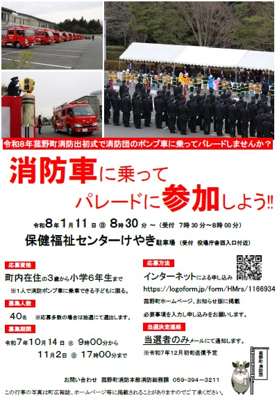 令和8年菰野町消防出初式の入場パレードにおいて消防団の消防ポンプ車に乗ってパレードに参加していただく「ちびっこ消防団員」を募集します。