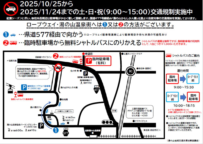紅葉シーズンに伴い、御在所岳周辺が著しく混雑することが予想されるため、下記の交通規制が実施されます。